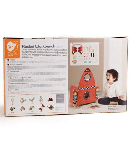 Yıldız krallığınızı inşa etmek için tornavida, anahtar, çekiç, cetvel, vida, somun, dişliler gibi araçları kullanın. Güçlü dişlileri çevirin ve uzaya doğru yol alın. Masa, çocukların yaratmalarına, inşa etmelerine ve icatlar yapmalarına yardımcı olacak hassas delikler ve boyutlarla tasarlanmıştır. Classic World Ahşap Roket Çalışma Tezgahı, çocukların ilgi alanlarını geliştirmelerine ve ince motor becerilerini artırmalarına olanak sağlar.