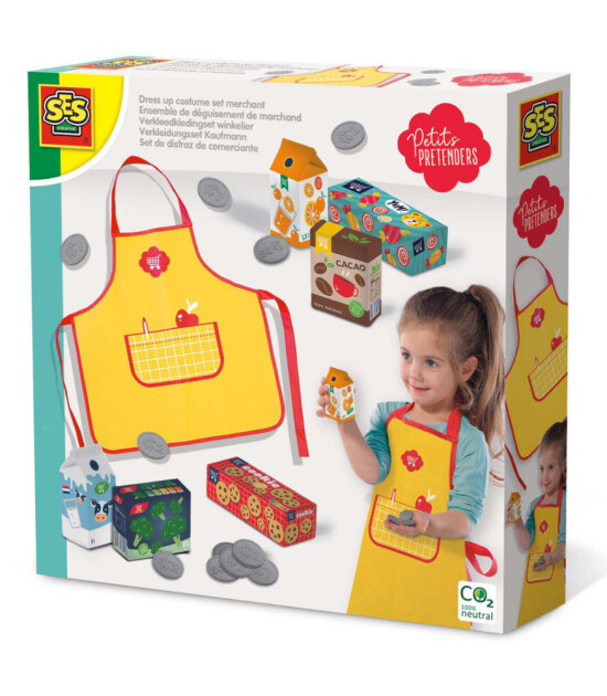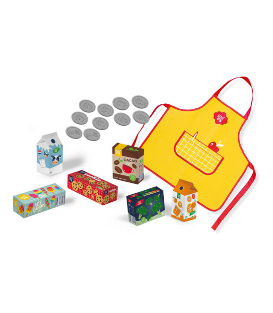 Önlüğünüzü takın ve gerçek bir satışçı olun! Bu kostüm ve oyun seti, 1 tezgahtar önlüğü, oyuncak bozuk paralar ve 6 karton süpermarket ürünü içerir. İlk müşteriniz geldi bile! Bir karton süt…